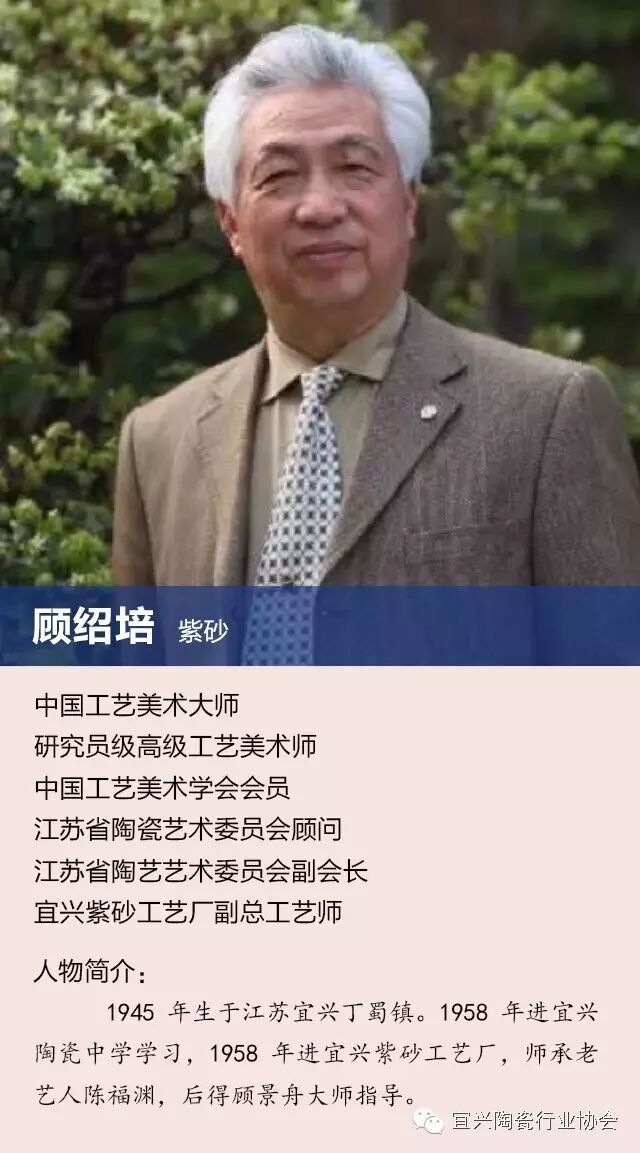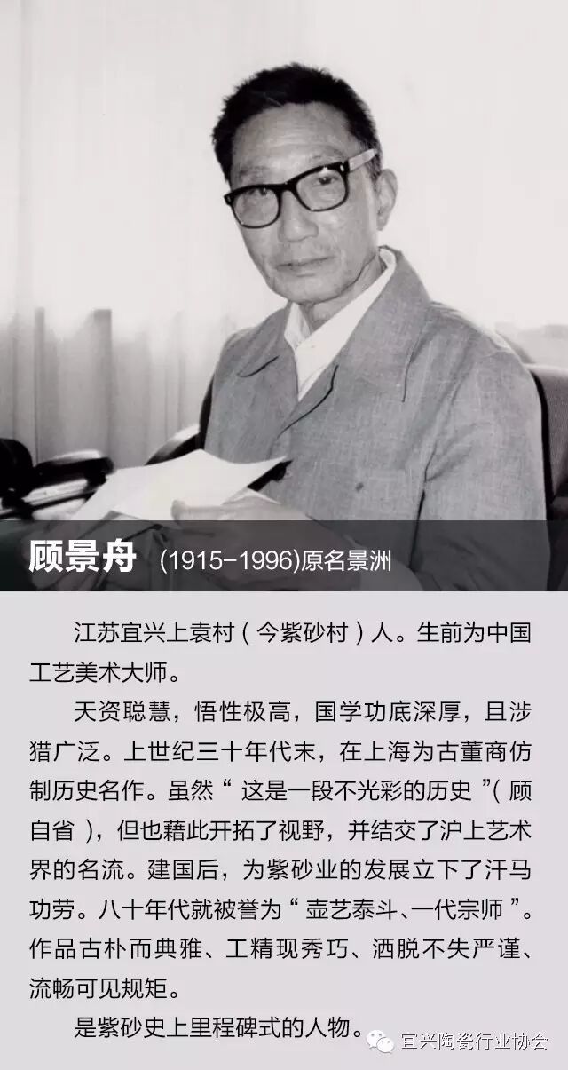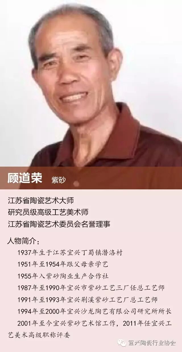 除宜兴产区外,江苏另有8名省级大师,他们分别是南京的许成权(紫砂)、陆斌(陶艺)、兰亭(日用陶瓷),苏州的杨丽华(青花),无锡的路朔良(紫砂),常州的王亚平(艺术陶瓷),镇江的邵同义(刻瓷),淮安的季云华(刻瓷)。 附:6位已故大师 一、顾景舟